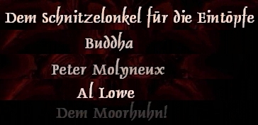 Ich möchte mich des weiteren bei allen bedanken, die mir indirekt bei diesem Guide geholfen haben. Vor allen Feanor und es_em für die schönen Bilder und Eastereggs. Auch bei der BdAI und allen anderen Bruderschaften möchte ich nochmals DANKE sagen